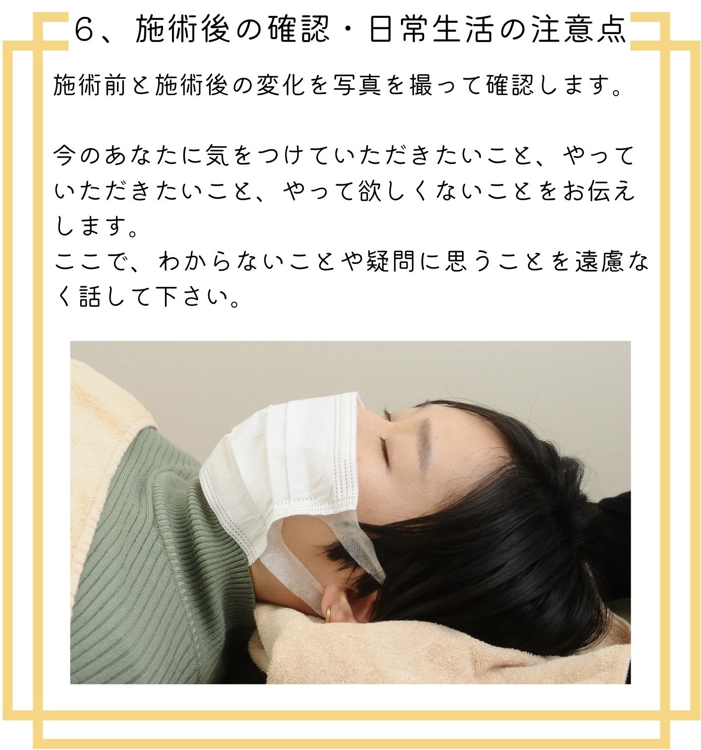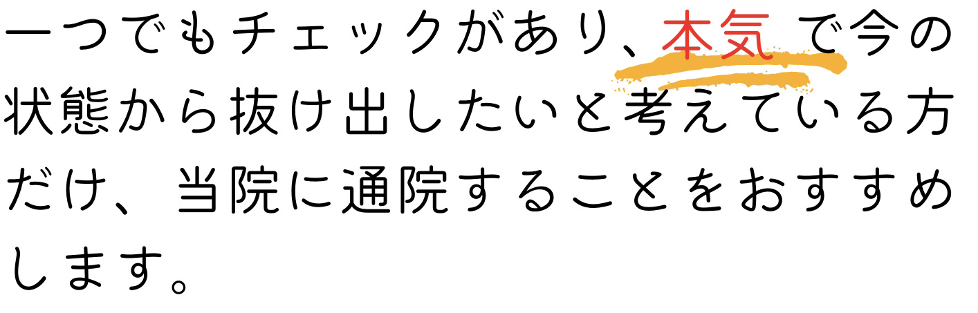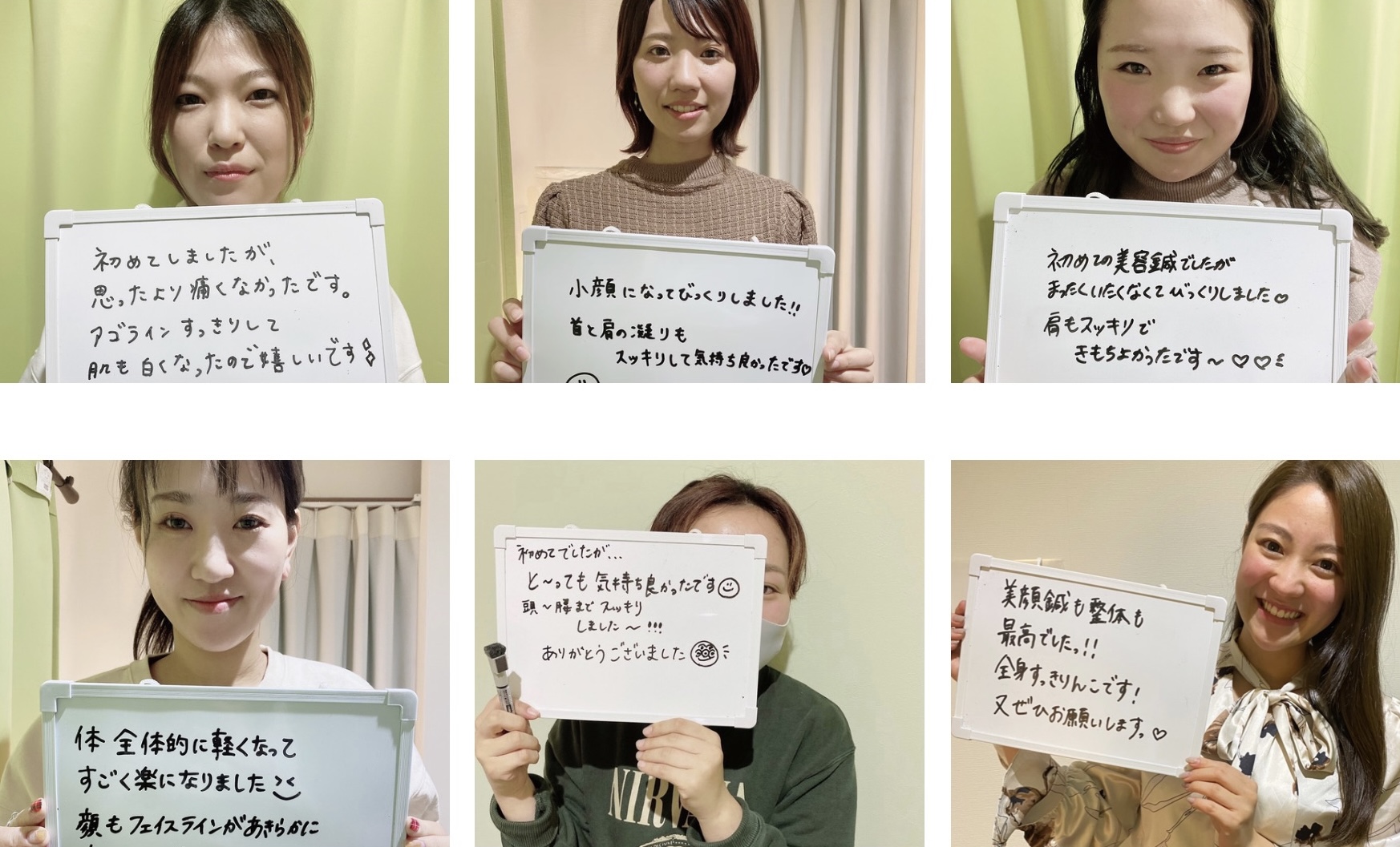 最初は歯の食い縛りがひどいのと、顔のたるみ、目の疲れを改善したくて、美容鍼で通っていましたが、今は美容鍼と整体でトータルでお世話になっています。