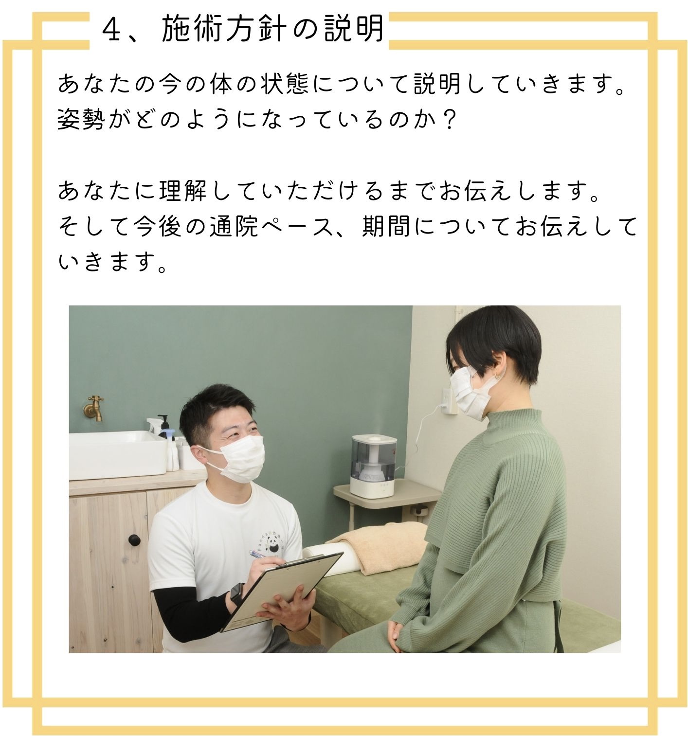 施術以外にも家でできるストレッチやトレーニングも教えて頂けるので、とてもありがたいです。